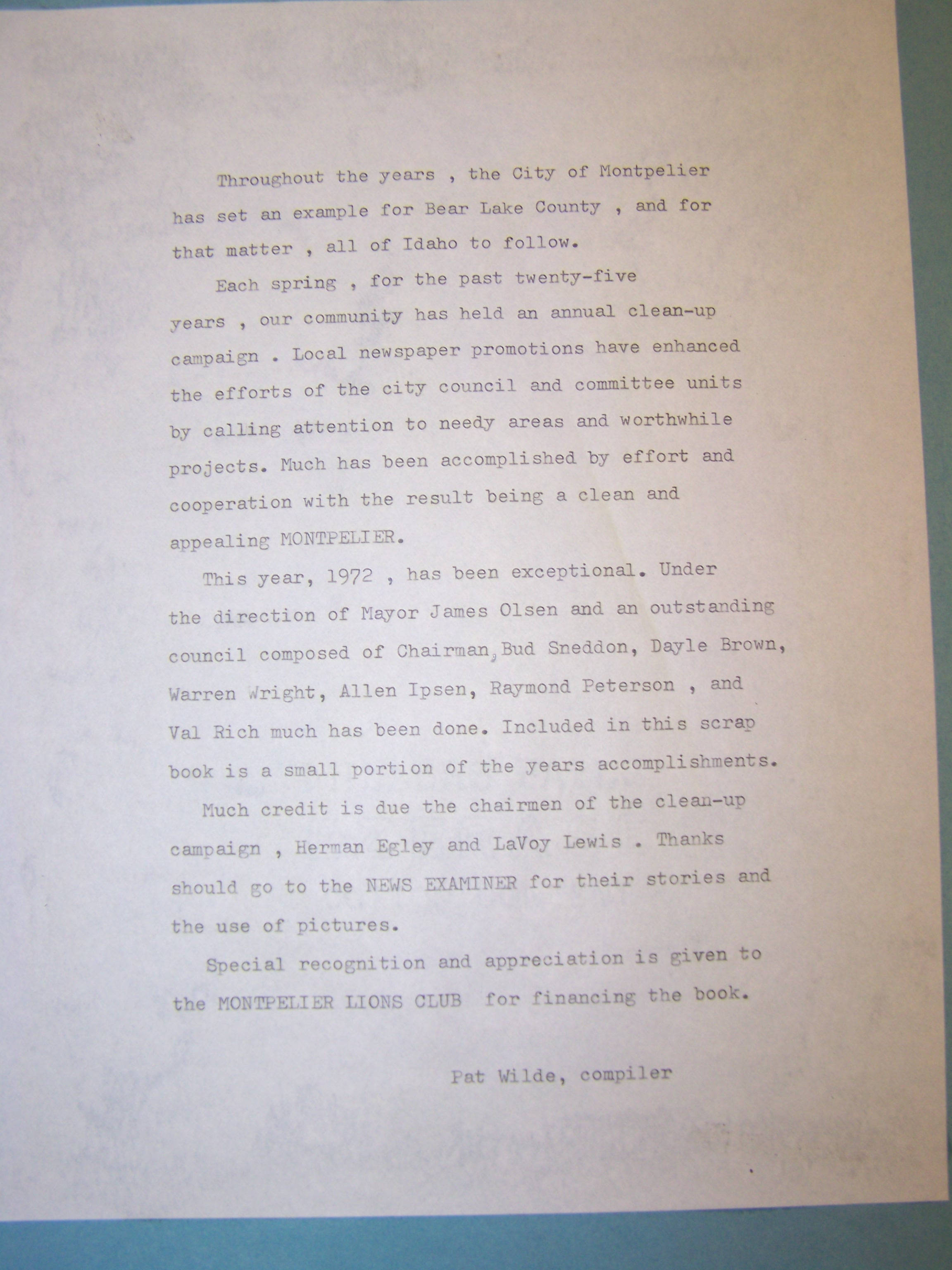 - Letter explaining Cleanup Campaign of 1972 in Montpelier, Idaho
