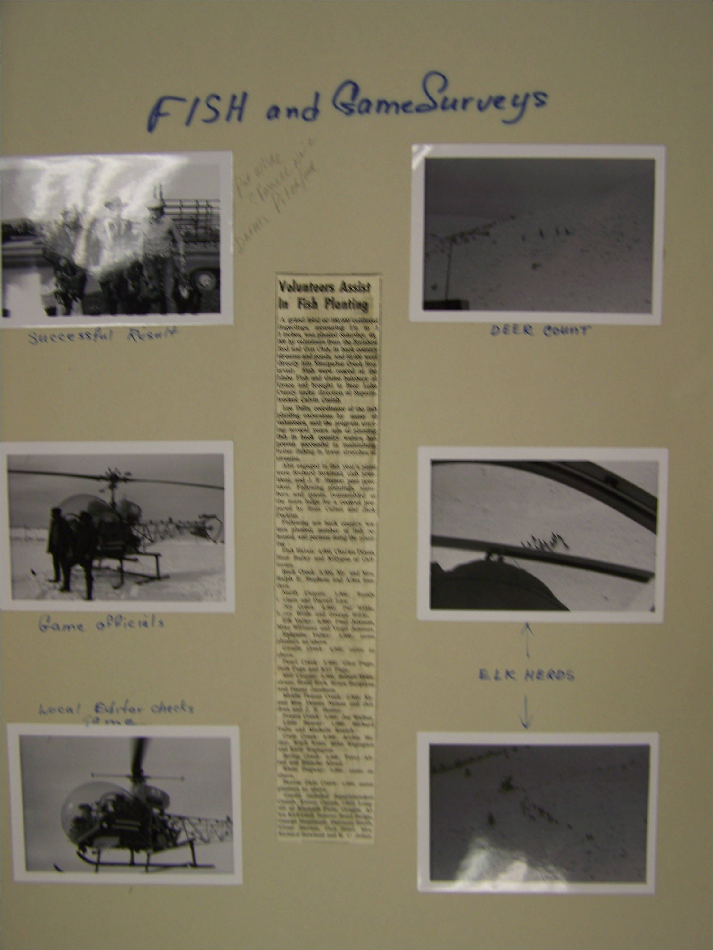 - B&W photos of game surveys of deer and elk herds as well as newspaper column of planting fish in Montpelier Reservoir ( Pat Wilde, Darwin Pitchford, Farrell Price)