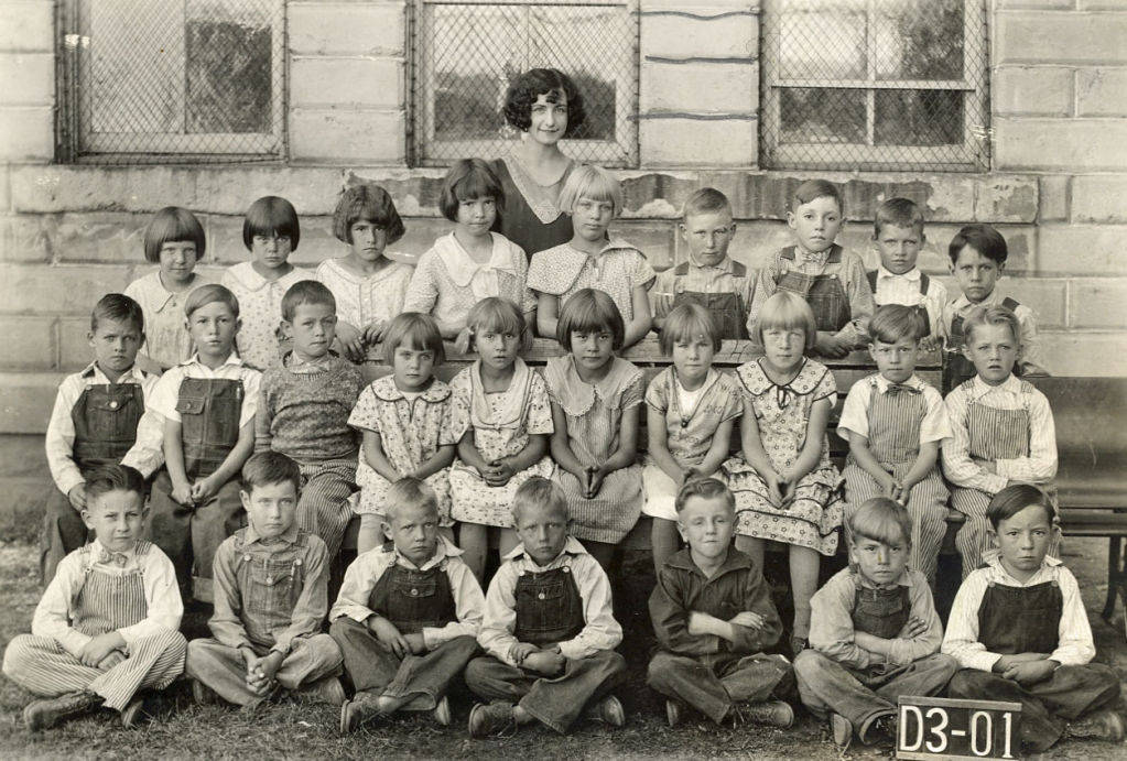 - School class grades 1, 2, and 3 of Arvilla Poole in 1929. Back Row, l to r: Margaret Hatch, Emma Cordon, Velma Kendall, Etta Hatch, Anna Kendall, Owen Wayment, Roy Croshaw, Warren Ericksen, Robert Baker. Middle Row: Woodrow Eriksen, Donald Fisher, William Bosworth, Netta Cordon, Maxine Baker, Phyliss Baker, Shirley Wayment, Anna Petty, Everett Farnsworth, Albert Hobson. Front Row: Glen Cox, Marion Olson, Roy Eriksen, Ray Eriksen,Eugene Henderson, Marion Baker, Elden Fisher.