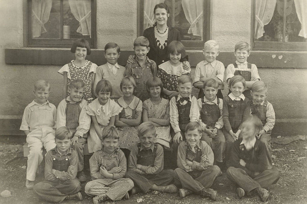 - Mrs. Felstead's first second and third grade class, 1933. Back row, l to r: June Boyce, Reid Redington, Odell Hatch, Thora Lewis, Darrel Eriksen, Gene Helmandollar. Middle row: max Croshaw, Rex Frew, Donna Jackson, Julia Anderson, Lola Ames, Leon Fisher, Harvey Henderson, Stan Fisher, Glen Baker. Front Row: Andrew Anderson, Joseph B. Hatch, Morgan Redington, alfred Olson, Cluff Kendall.