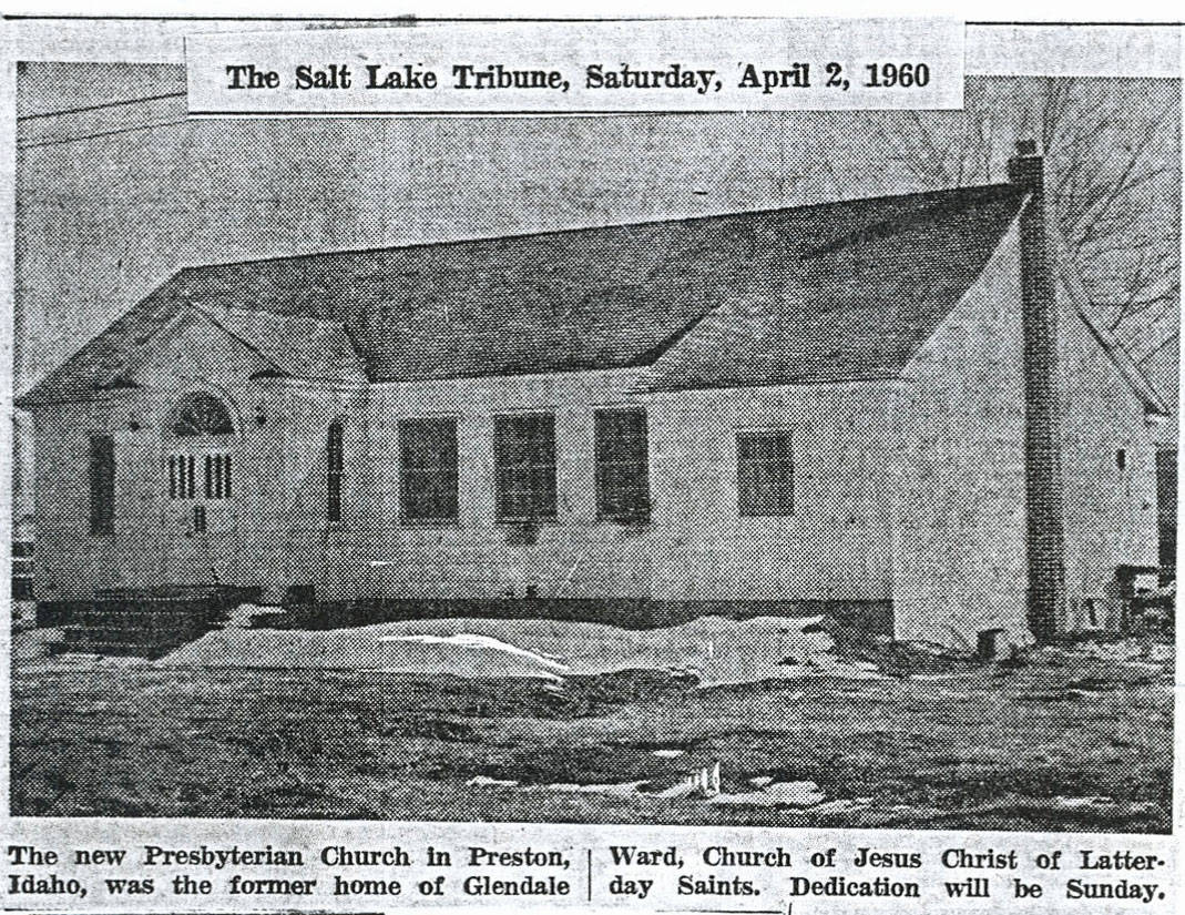 - In 1960, the Presbyterian Community Church bought the Glendale LDS Church building and moved it to Preston. Shown here is the building placed on the prepared foundation. A new oil furnace was installed.